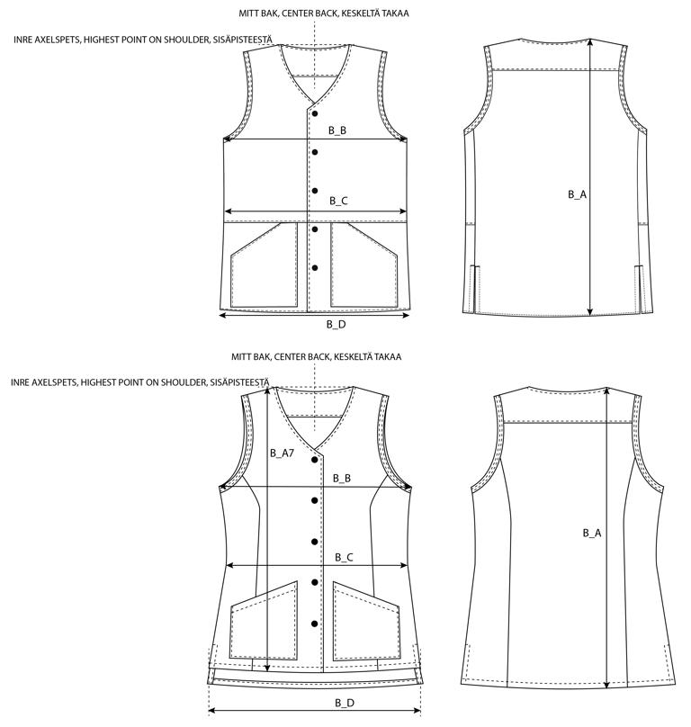 Damväst med något insväng i midjan, slitsar i nederkant och tryckknappar i framkant. Bröstficka och två snedställda fickor fram. Rygglängd 68 cm i storlek M.